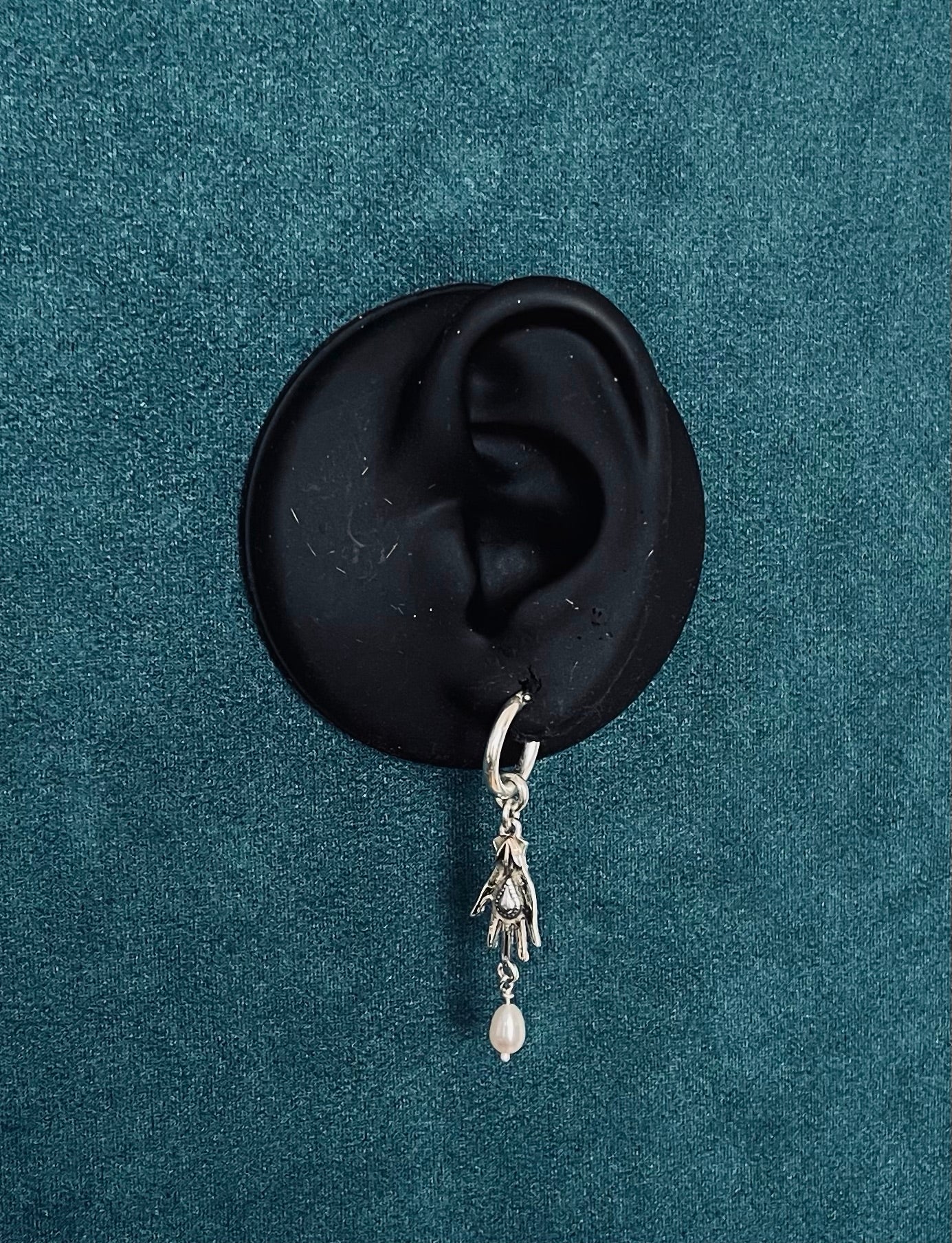 Beautifully detailed little sterling silver hand drops holding a 5mm cultured fresh water pearl on a 12mm creole hinged hoop earring