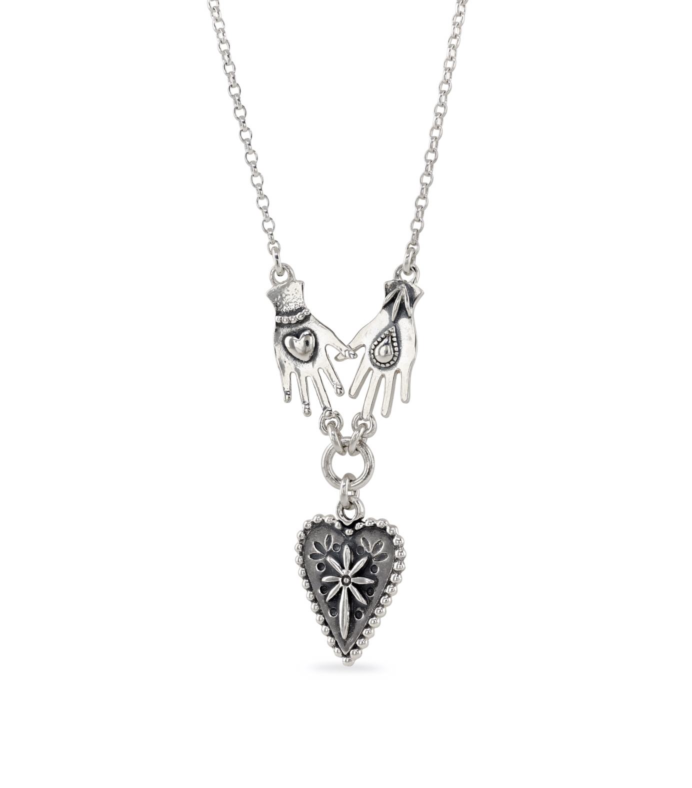 Two tiny silver hands holding a sacred heart drop on an oval belcher chain. Double sided 16” overall length.