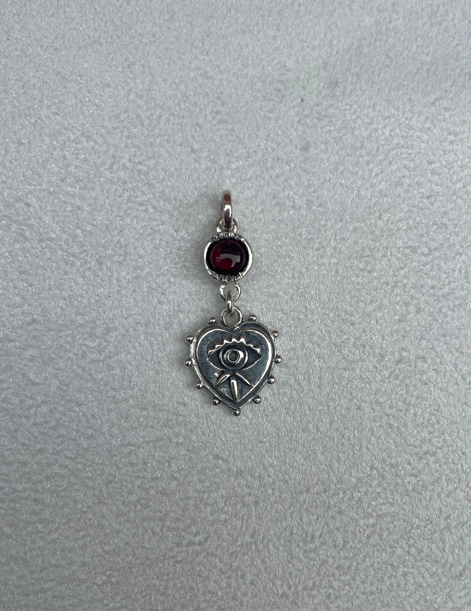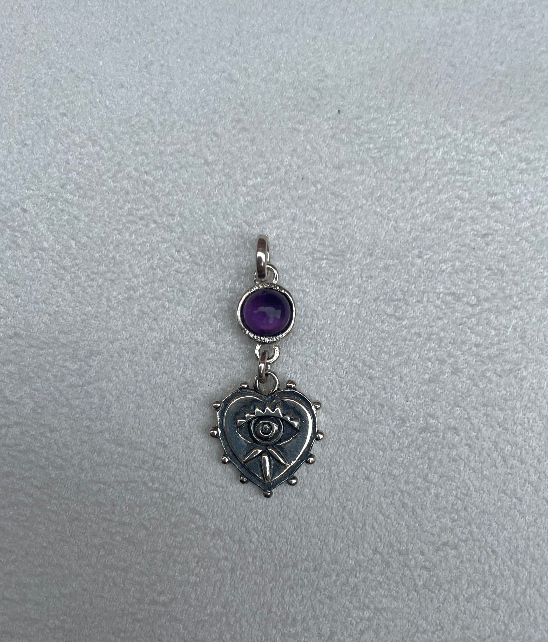 Solid sterling silver heart with little bobbles around the frame hanging beneath a semi precious stone, choose from blue topaz, garnet or amethyst.