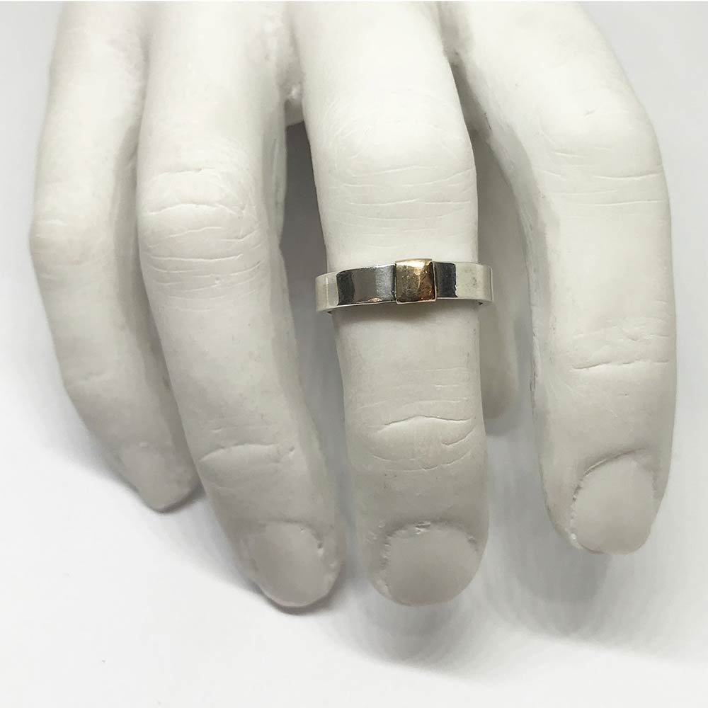 Lovely sterling silver heavy court ring with wrap around 9 carat gold square detail.Hand made in our own workshop based here in Leicester.